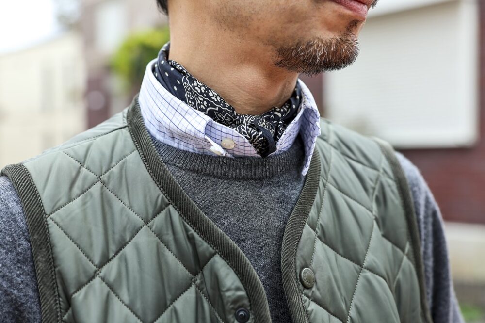 軽快かつ保温性のある便利であるため大島さんの最近トレンドだというベスト。ナイロンキルティングにトリムが施された英国ブランドとして長い歴史を誇るラベンハムらしいデザイン。私物