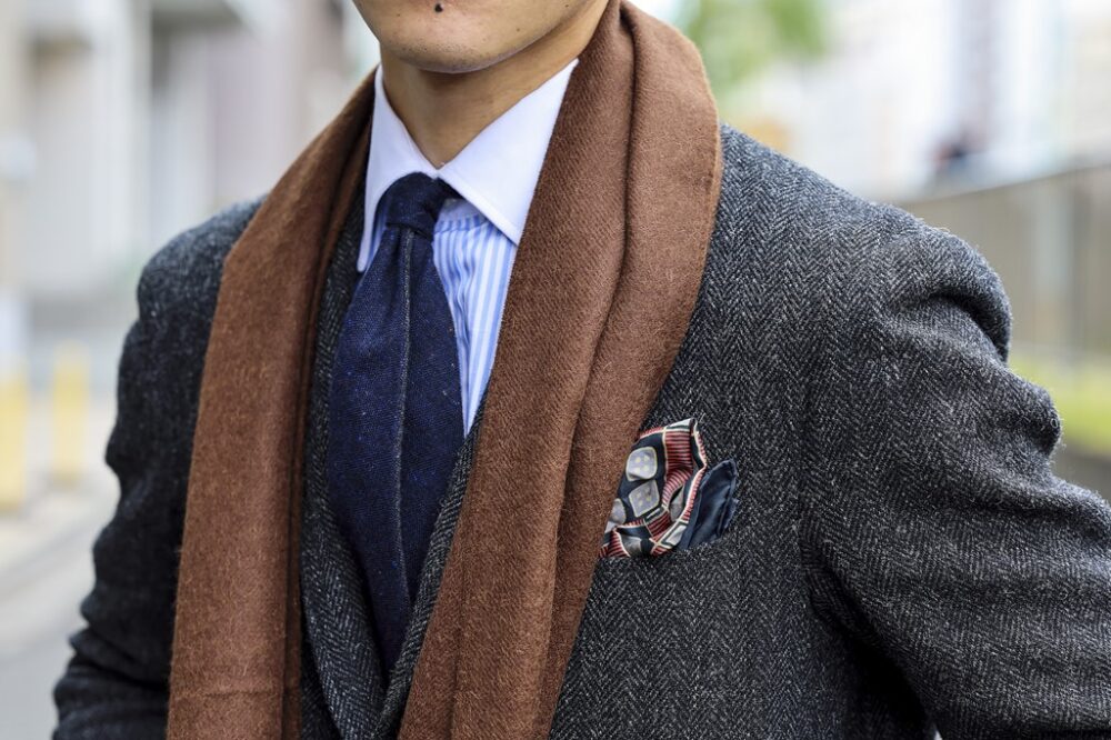 さりげなくコーディネイトのポイントとなっている首元のレイヤード。ほどよい緩さもありジェントルマンな装いに。色や柄、素材の組み合わせの妙を楽しむのも面白み。