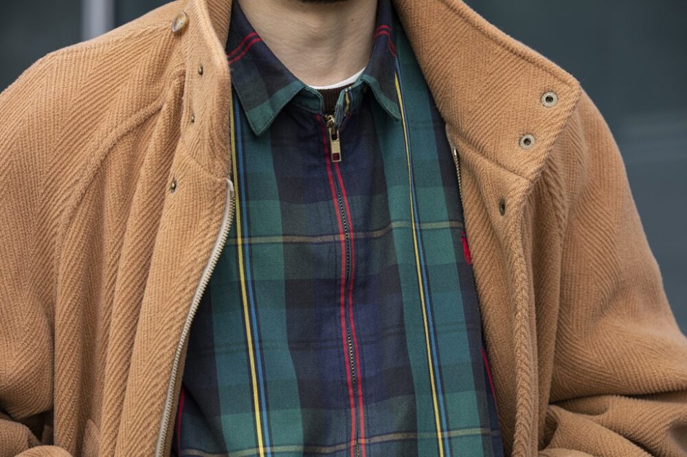 着こなしの中核を担うのがフォックスツイード社の生地を使ったハリントンジャケット。このアイテムをメインに、色柄をポイントに落とし込むことで、しっかりと格式を保ったまま遊び心のあるスタイリングを演出する。「理想の英国紳士像をちょっとポップな色使いで表現しました」