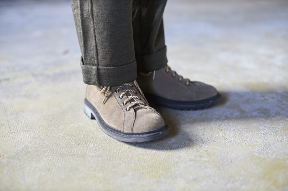 「シューレースはパラブーツに付属していたものに付け替えて履いています。ミドルカットで履きやすく、今日のようなスタイリングにはもってこいですね」