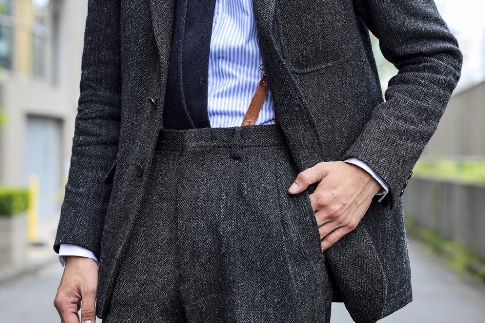 チャコールのヘリンボーンツイルのセットを軸に男らしさと英国らしいジェントルマンな雰囲気を演出したブリトラスタイル。ファブリックやディテールで 英国を強く意識したそう。