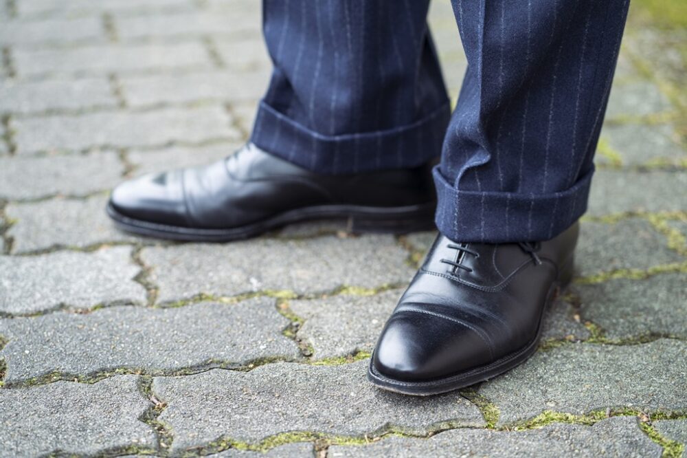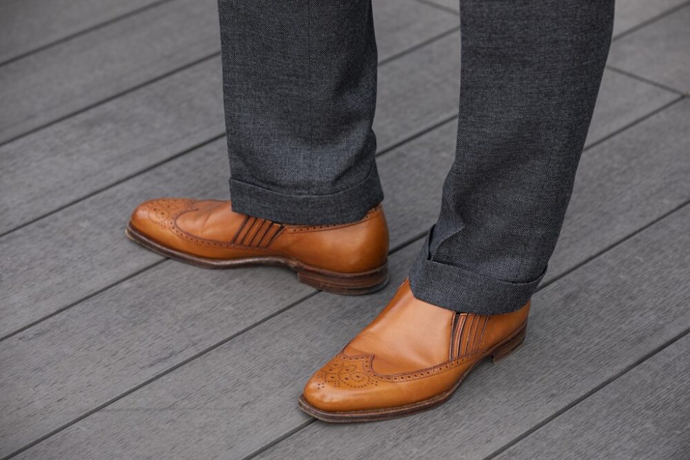 ドレッシーなサイドエラスティックシューズなので、ダブル仕上げのスラックスをチョイスしている。丈や裾幅のバランスも完璧なので参考にしたい。
