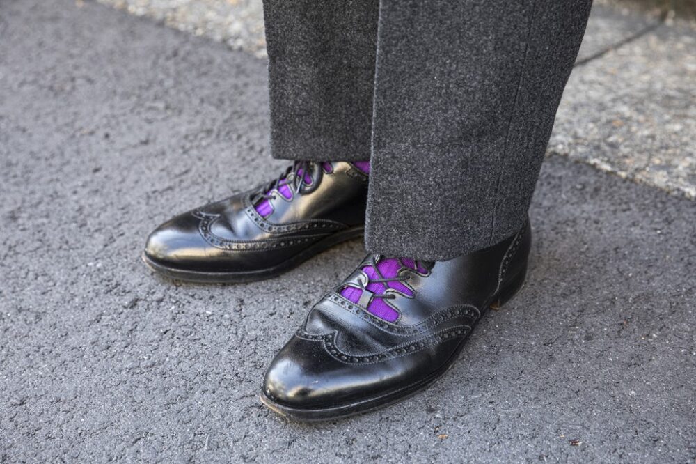 元々はスコットランド民謡で踊る時に履く、舞踏用の伝統シューズだという「ギリーシューズ」を足元にチョイス。「今日のように派手色のソックスと併用して履くことが多いですね」。私物