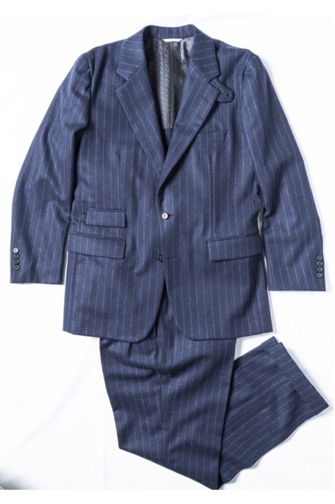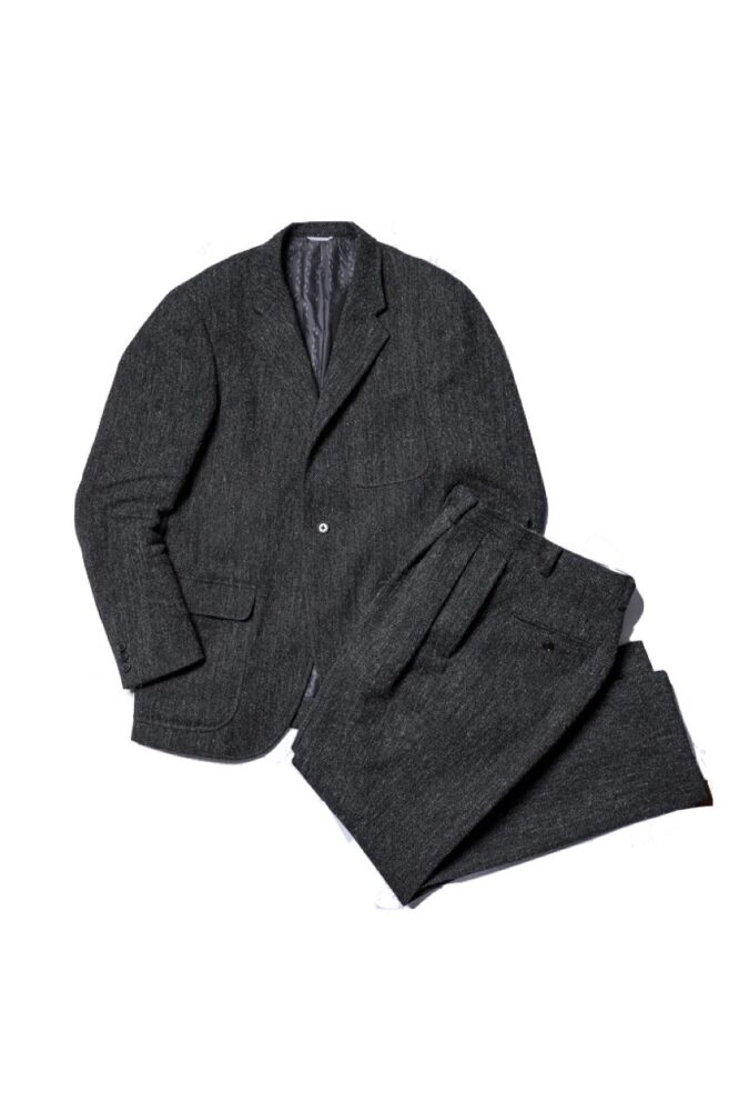 「フォックスフランネルの生地を採用しています。形は80’sのアメリカのスー ツをベースにしたVゾーン深めの2ボタンで、ベントが深めに入ります。パンツ もややゆとりのあるストレートです」