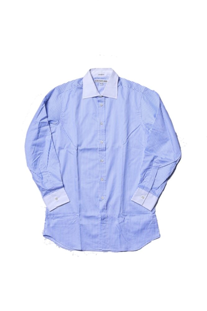 アメトラのシャツメーカーでありながら、襟型は英国由来のウィンザーカラーを採用したクレリックシャツ。堂々たる風格を演出するワイドスプレッドのカラーが印象的。3万8500円