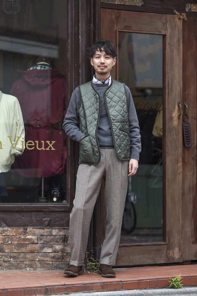 衣装クレジット/ベスト/ラベンハム、ニット /コルヘイス、シャツ/ボルゾネッラ、パンツ/ PT トリノ、シューズ/クラークス すべて私物