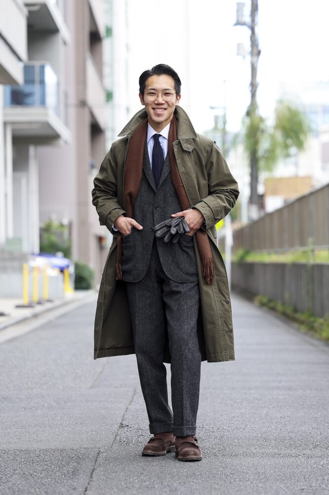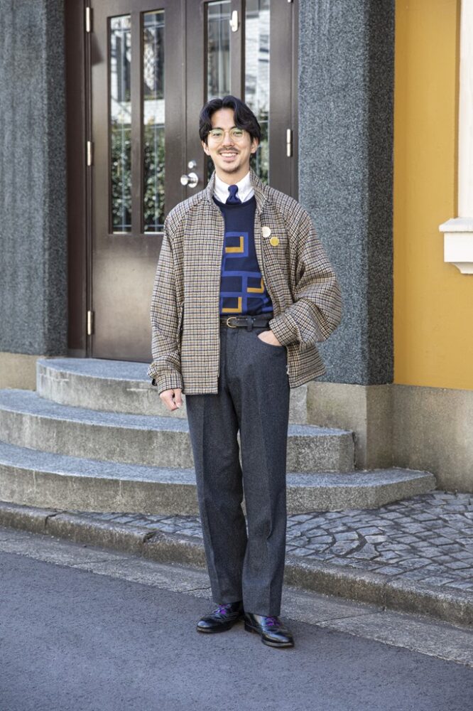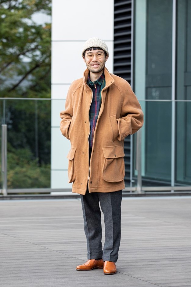見えない部分にも遊び心を取り入れ、ストーリー性のあるスタイリングが人気の小野さん。英国に由来を持つアイテムで堅め、温かみのある色・生地使いやサイズバランスの妙は、さすがのひと言。
