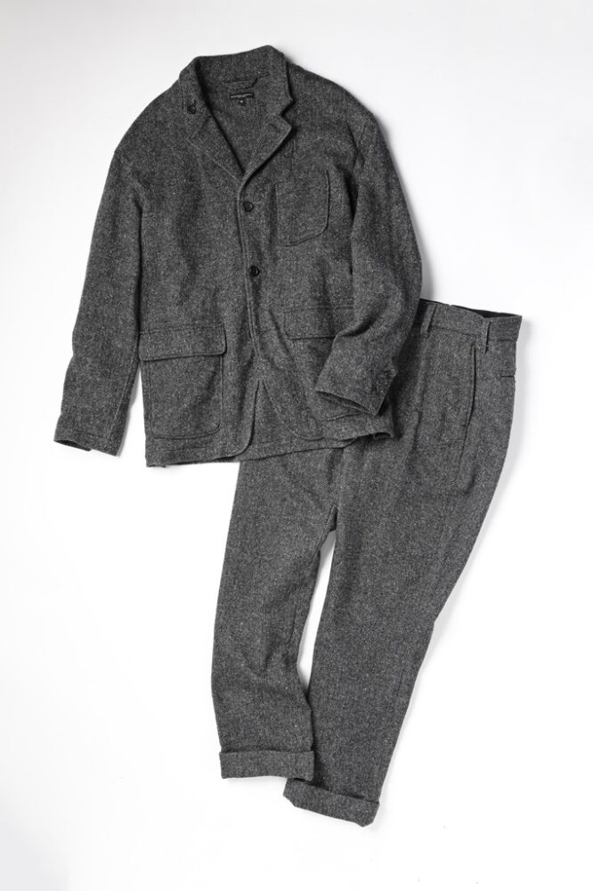 ブランド定番のウールポリ混紡素材を使用。軽い素材感で、シャツに近い感覚のロイタージャケットとの相性はいうまでもない。ジャケット5万9400円、パンツ4万7300円(エンジニアド ガーメンツTEL03-6419-1798)