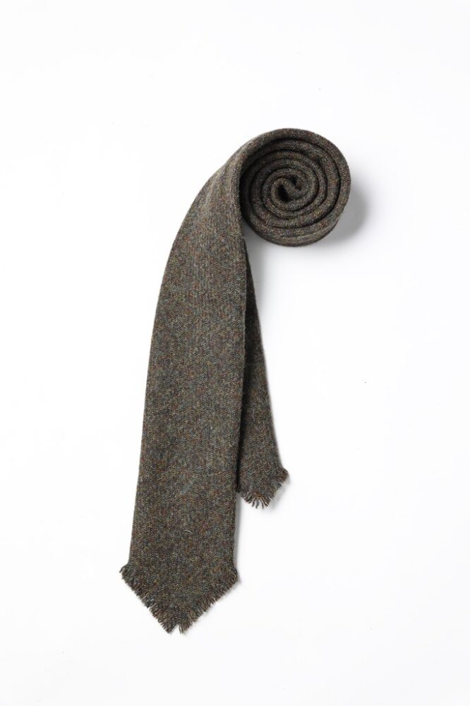 ハリスツイードを採用したタイは服地の素材を流用しているため、小物らしからぬ肉厚な仕立てが特徴的。ボリューム感のあるノットと剣先のフリンジが個性を演出する。1万8810円(シップス 銀座店TEL03-3564-5547)