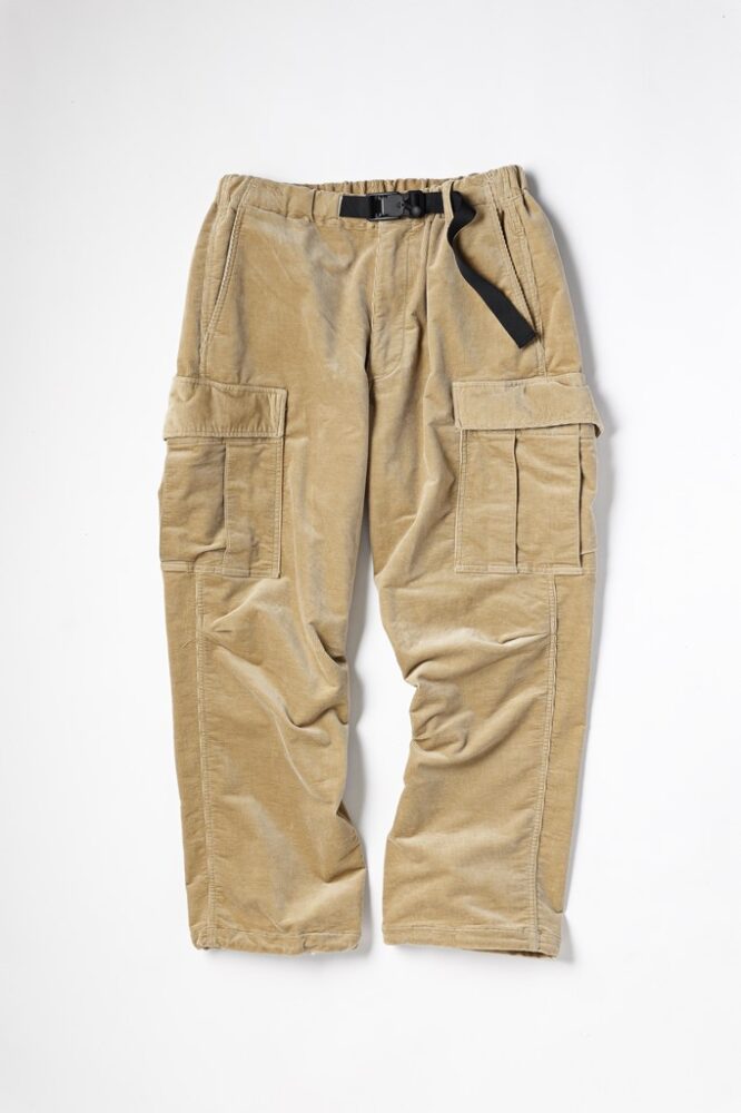 古着市場で高騰をみせる60年代のジャングルファティーグパンツをウェビングベルト仕様&コーデュロイで再構築。コロナの「ファティーグスラックス」ラインの新作として登場。3万7400円(BAKU TEL03-6300-5043)