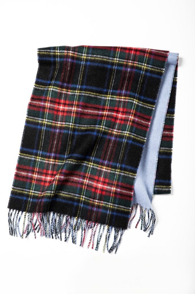 別注カシミヤマフラー。柄のサイズを縮小したタータンの裏側が無地の水色。4万4000円(ヴァルカナイズ・ロンドンTEL03-5464-5255)