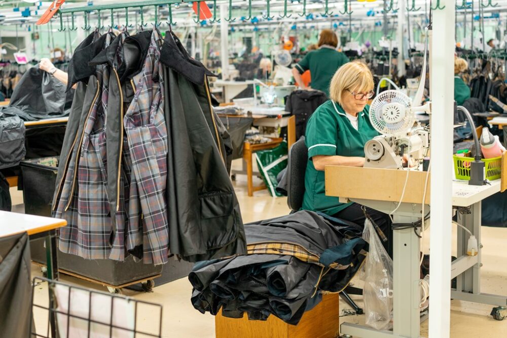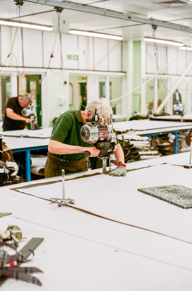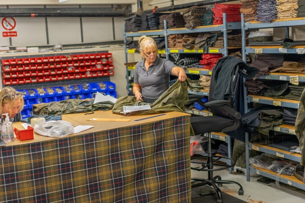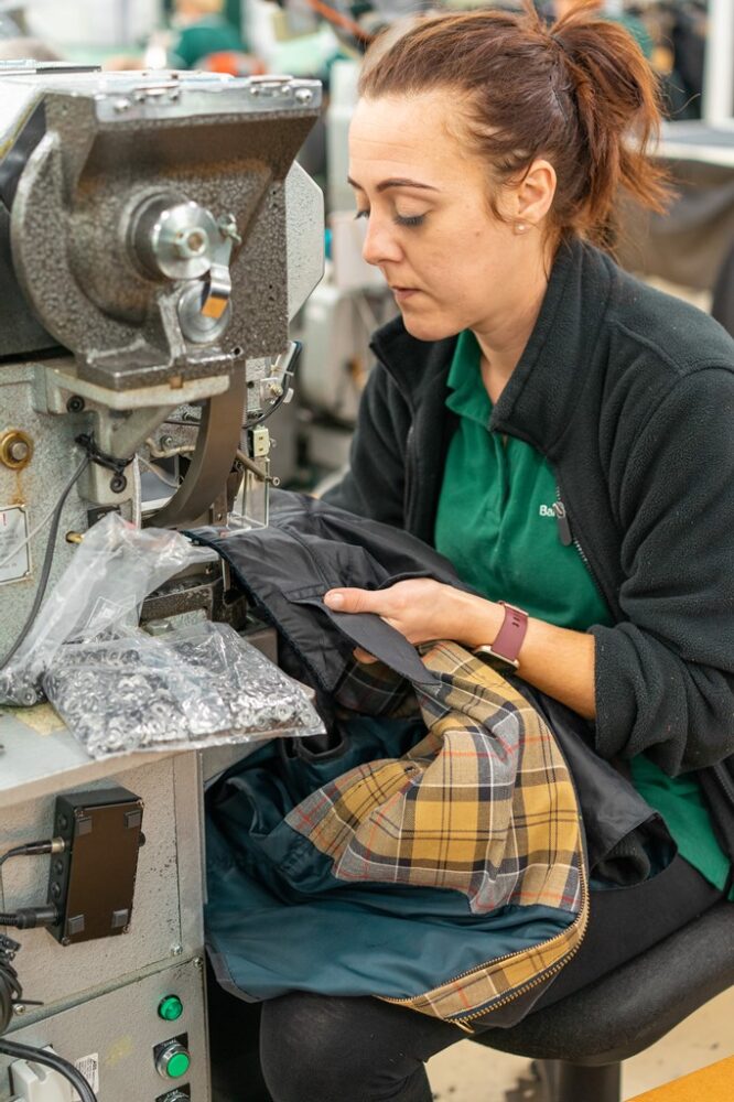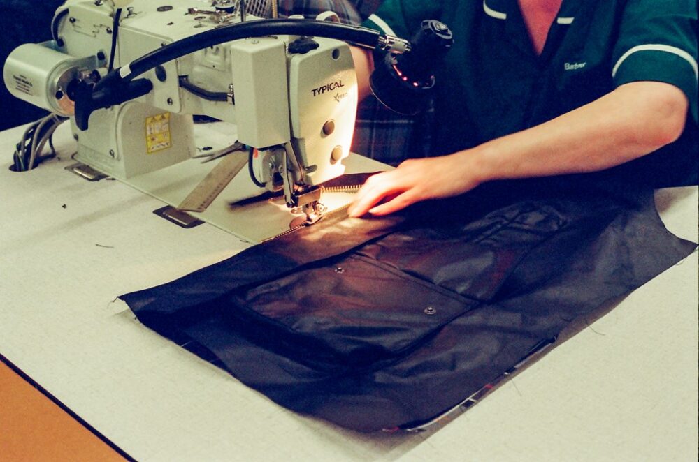そういったバブアーの原点やアイデンティティは、ものづくりからも伺い知ることができる。生地の裁断からはじまるジャケットの製作は縫製や各パーツの取り付け、ワックス仕上げに至るまで、そのほとんどがいまだに人の手によるもの。工場内を見渡しても大掛かりな機械は皆無に等しく、無数のミシンが奏でるリズミカルな音だけが響き渡る。