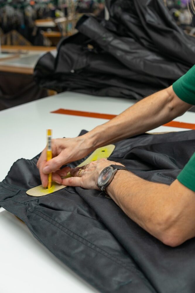 ワックスコットンは英国老舗生地メーカーからロールの状態で供給される。裁断には未だ手描きのパターンシートを用いるなど、その作業は予想以上にアナログだ。