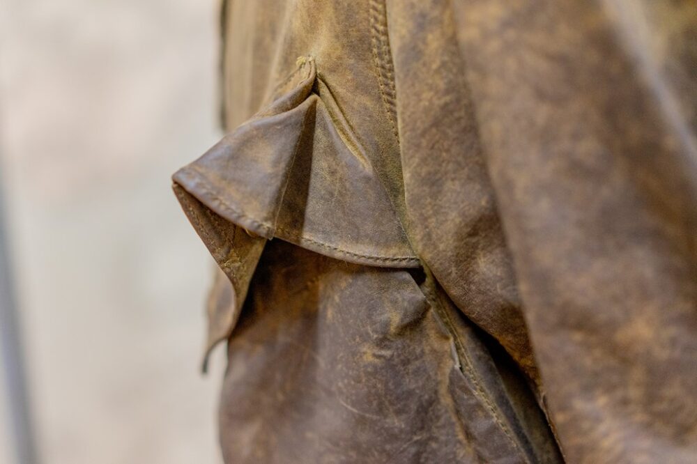ベルベット素材の襟や立体的な袖のパターン、フラップ裏にあるポケット口の両側には補強用のレザーが縫い付けられるなど、テーラリング文化の英国らしい、丁寧な作りに感服。