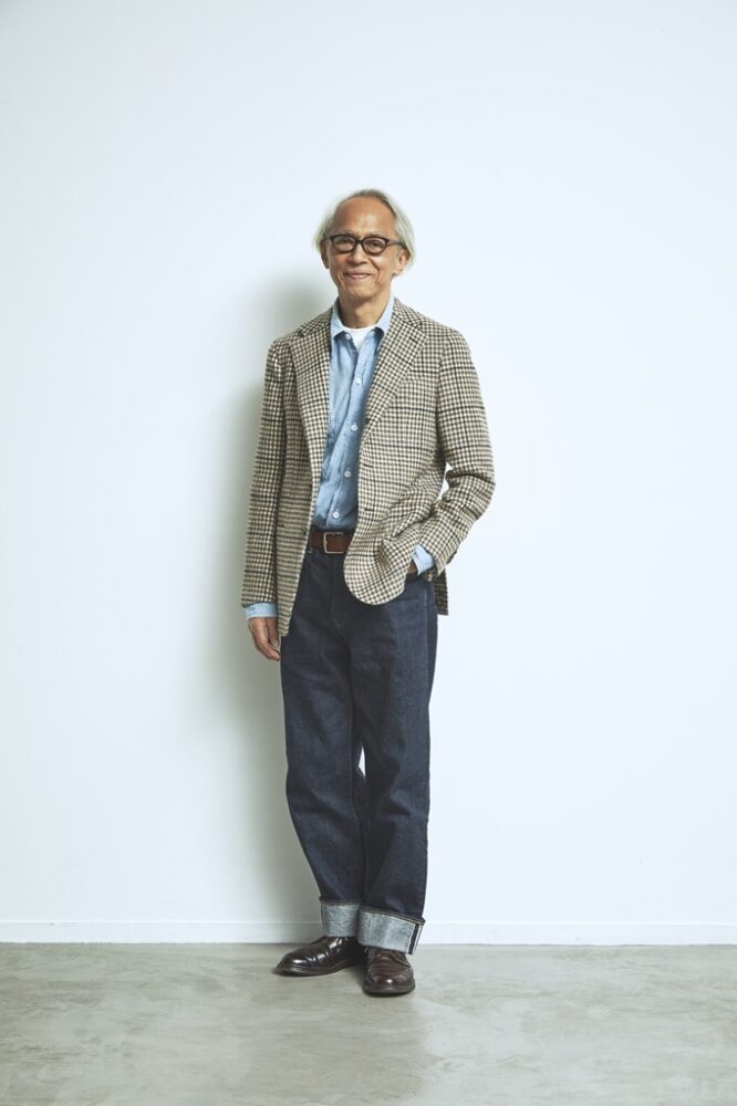カルーゾのガンクラブチェック柄ジャケットにワンウォッシュデニムをロールアップ、足元にオールデンのコードバンを合わせた栗野さん。ダンガリーシャツはビックマックのものでなんと40年以上前に入手したのだとか。「洋服愛」と各アイテムの絶妙なバランスには唸るばかり。