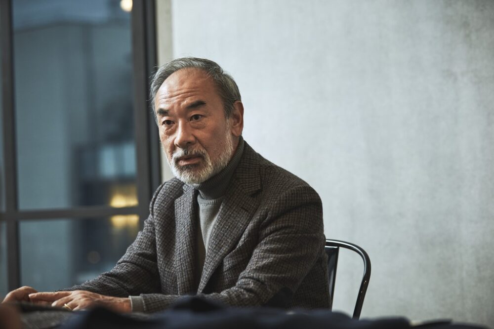 中尾さんはエルボーパッチつきでレザーのくるみボタンというカントリーライクなカルーゾのツイードジャケットを着て登場。ジャケットの柄に使われている色を拾ってグレーとネイビーでシックにまとめている。ジャケットの肩線の美しさには目を見張るものがある。