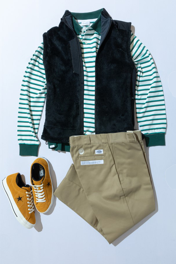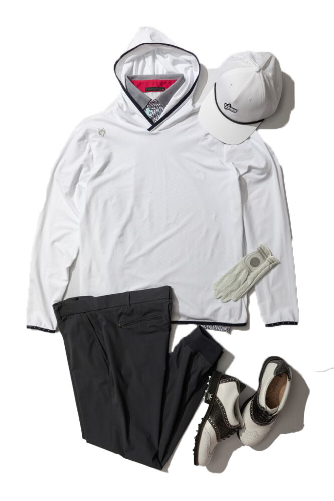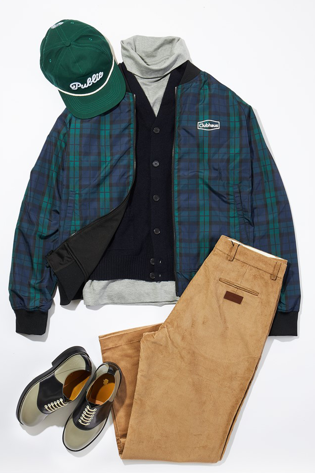 欧州や米国から旬なゴルフアパレル、アクセサリーをいち早く日本に紹介するだけでなく、「マルボンゴルフ」を始め、オリジナルブランド「CLUBHAUS」とのコラボレーションにも積極的で、セレクトショップの枠を超えたカルチャー発信が魅力。今季のリコメンドは、英国発の「マナーズ」とオリジナルをミックスした上品なレイヤードスタイル。チェックのアウターはリバーシブル、 パンツの太めのシルエットがモダンだ。