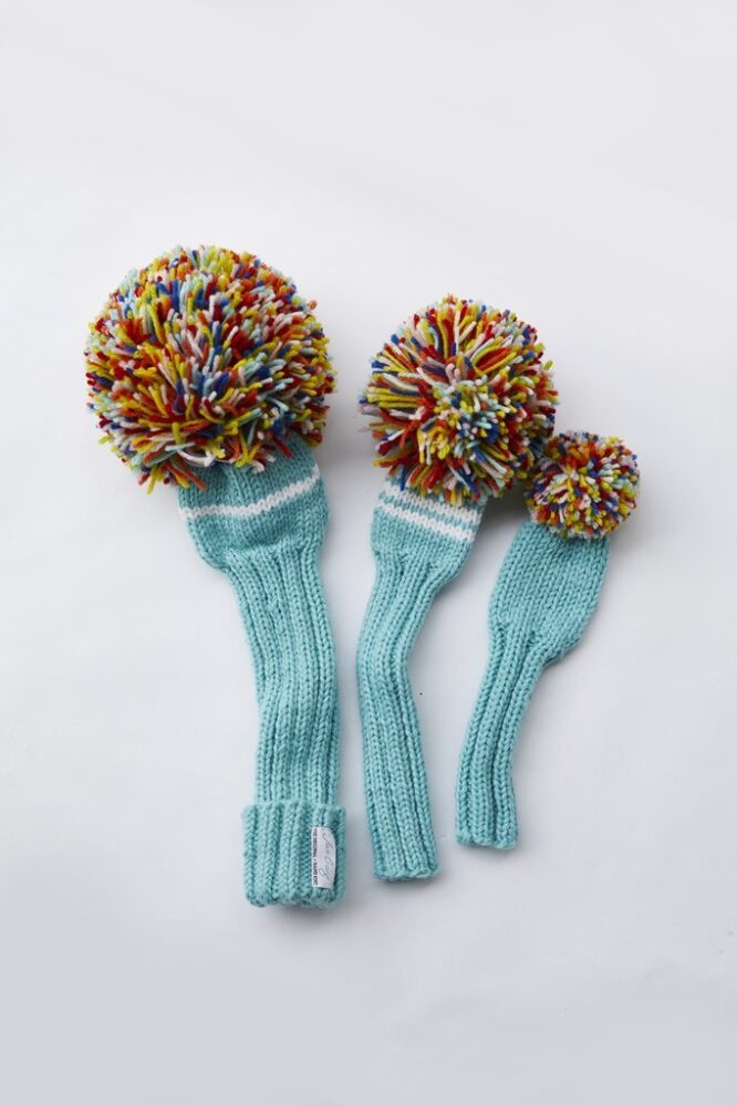 ポンポンのサイズや柄、色をオーダーする「ジャンクレイグ」のニットカバー。DR1万890円、FW9460円、UT6105円