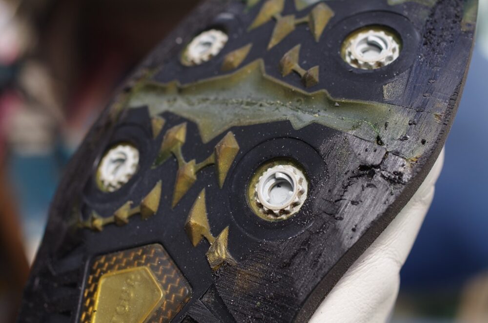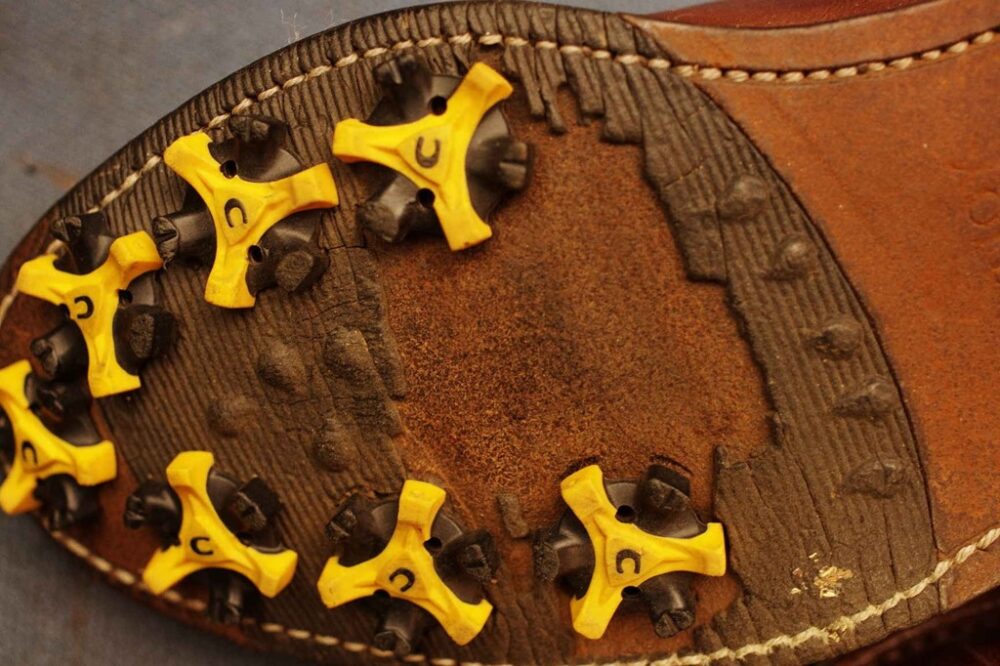 ハーフソールゴムが加水分解し破損。ミシュラン製のハーフソールゴムをボンド接着し、目立たないように同色のステッチで縫いつけ、新しいソフトスパイクピンをセットした。
