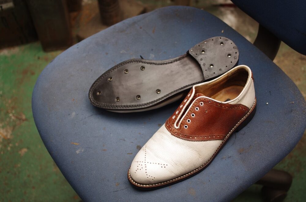 本格的な本革ソールのゴルフシューズ。革ソールと金属プレート一体型メスネジの位置出しをして交換、ヒールトップも本革製だったので、本革製で製作。