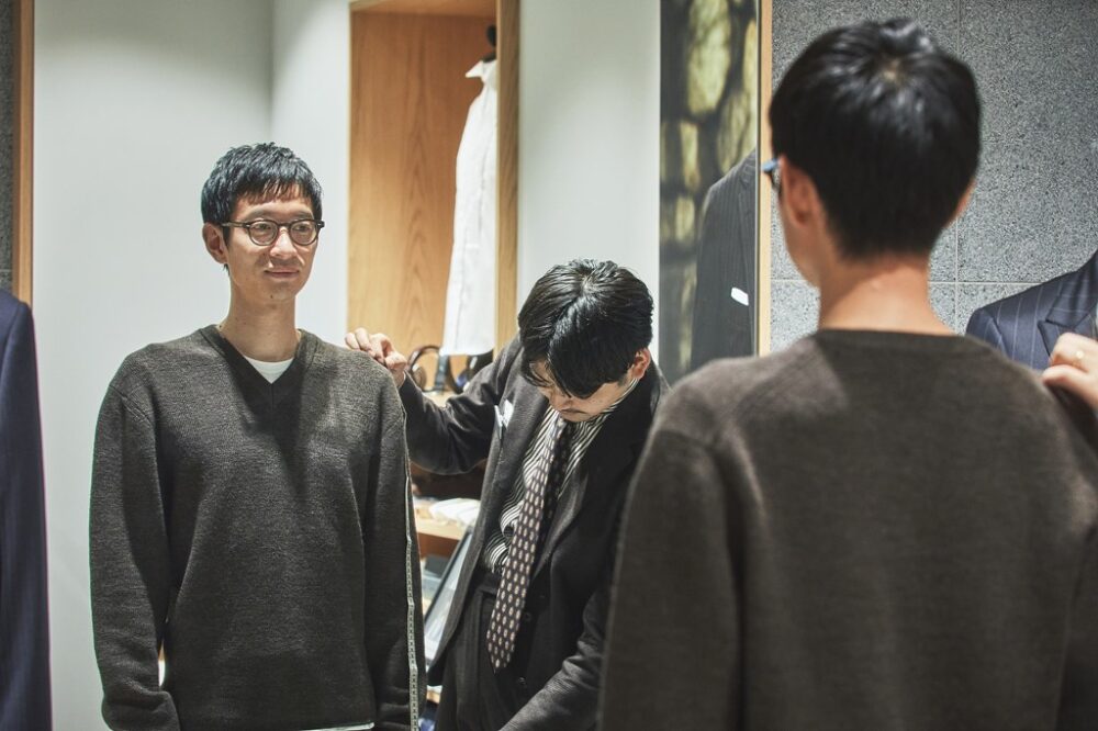 豊富なテーラー経験を持つスタッフによって胴回りや腕の長さなど細部にわたって採寸。高級スーツをオーダーする際と同じ様なプロセスを踏んでいく。