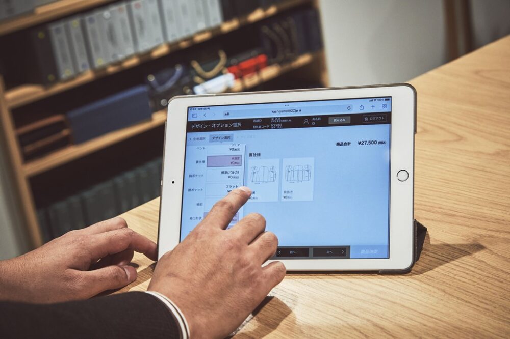 オーダースーツを主に取り扱うKASHIYAMAだけに、生地選びから細かな採寸まで経験豊富なテーラーが対応する信頼感は絶大。憧れの本格オーダーを体験できる。