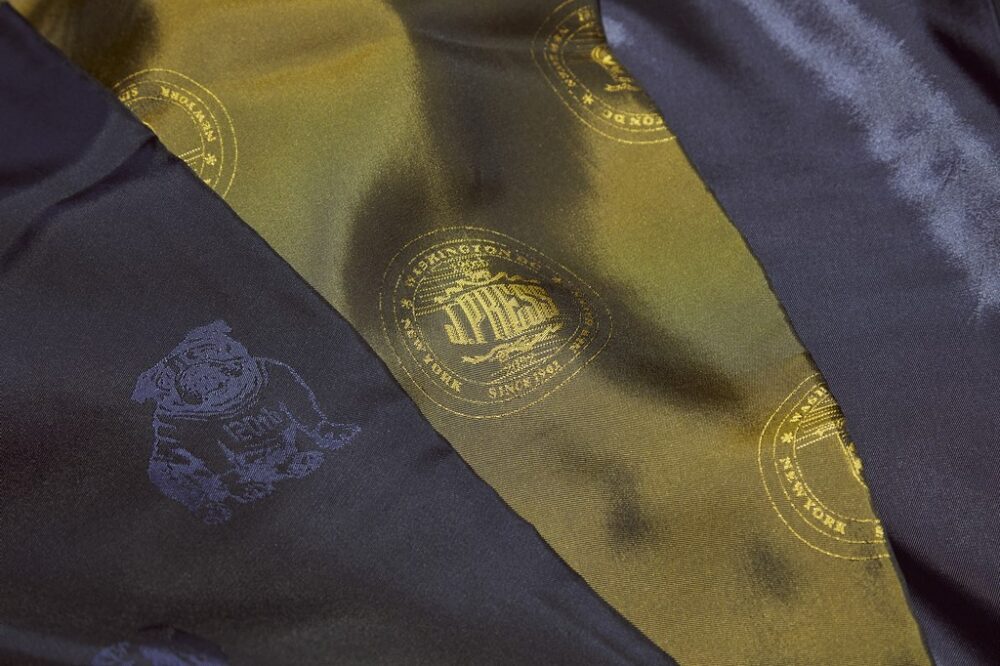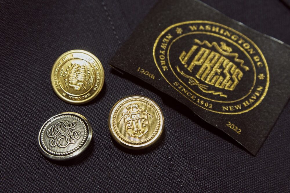 ゴールドはボタンの刻印と合わせて120周年アニバーサリーのロゴとクレストを配置。ネイビーはJ.プレスとイェール大学運動部のマスコットキャラクターであるお馴染みのブルドッグをあしらう。ネイビー単色も用意。すべてキュプラ100%。