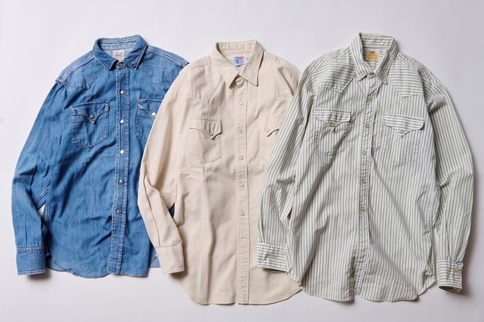 リーバイスが手掛けたウエスタンシャツ。左からショートホーン、サドルマン。右はスリムフィットネームでストレッチ素材が使用されている。