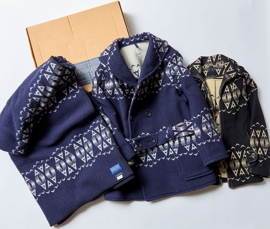 サイズ的に女性用として作られただろう1930年代のペンドルトンのジャケット(右)。柄のモチーフの中に「A」をあしらったようなデザインに着目し、アナトミカネームでブランケットを75枚製作したのが2014年。そのブランケットを使い本社工場にて、手裁断から、すべてハンドメイドで仕上げたマッキノーコートもインパクト大。