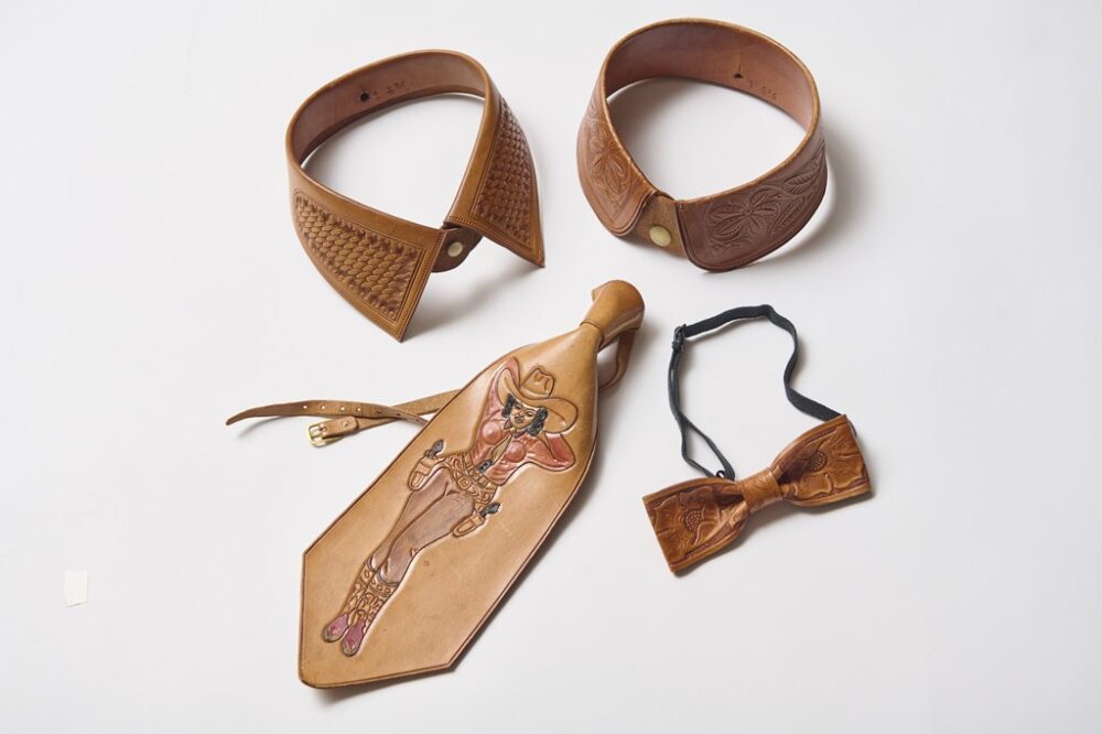 シャツの襟に装着するレザーのカラーとタイ。カービングが施されており、もちろんすべて1点もの。ウエスタン系には珍しい襟型であるラウンドカラーなどデザインも凝っている。