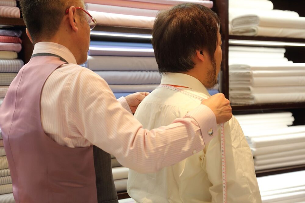 同店にはかつて大正天皇からオーダーを請け負った際、職人が採寸に伺ったものの、直接採寸することは許されず、3メートルほど離れた位置から目分量で測定した、という逸話が残る。そして現在の同店には、その逸話に匹敵するほど卓越した採寸術を駆使する、35年以上のキャリアを誇るスタッフが複数在籍している。