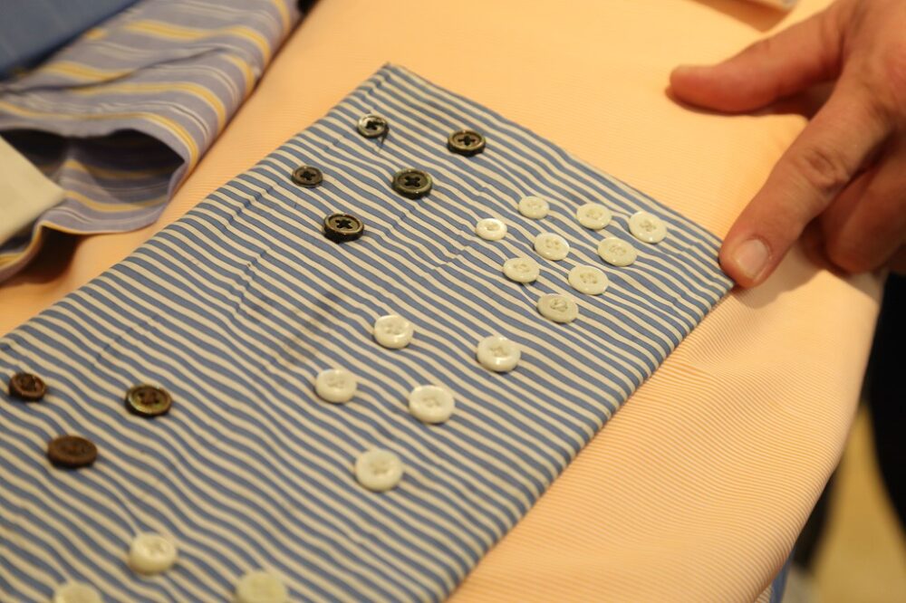 さらに顧客のイメージを掻き立てる助力になるよう、常時数百種類以上の生地を反で陳列。衿やカフスの型も豊富な選択肢が用意されているほか、存在感と耐久性を考慮して作られた、3.5mm厚の白蝶貝ボタンをオリジナルで製作するなど、副資材にもこだわり抜いている。