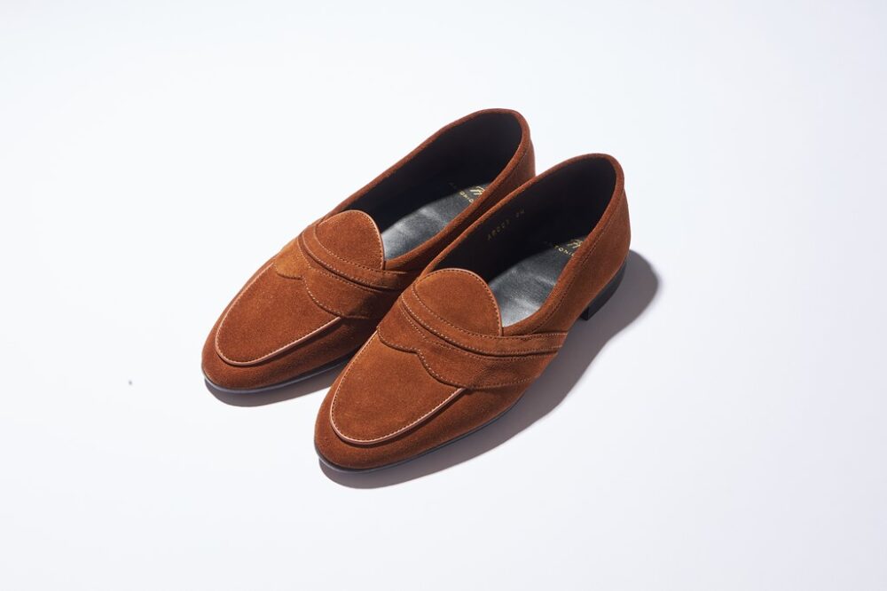 パンツの太さに合わせて靴もボリューム感が求められがちですが、あえてナローなベルジャンでトッぽく。個人的には新境地開拓的な一足となりそうです。3万9600円(トレーディングポスト 青山本店TEL03-5474-8725)