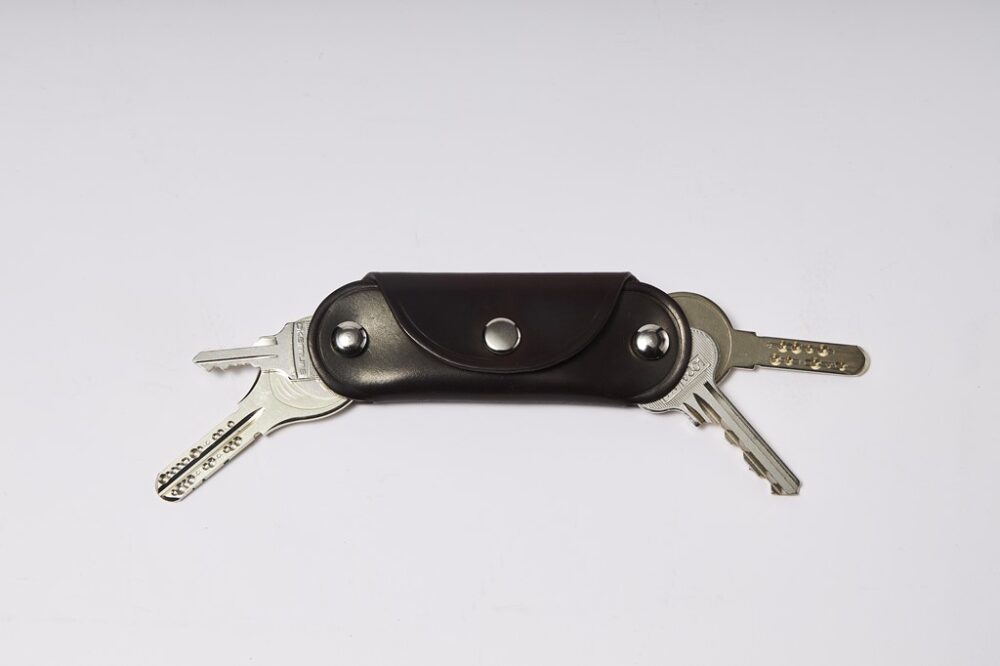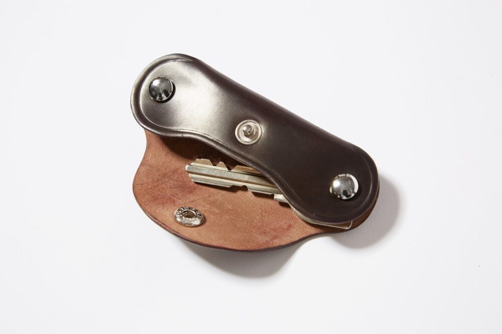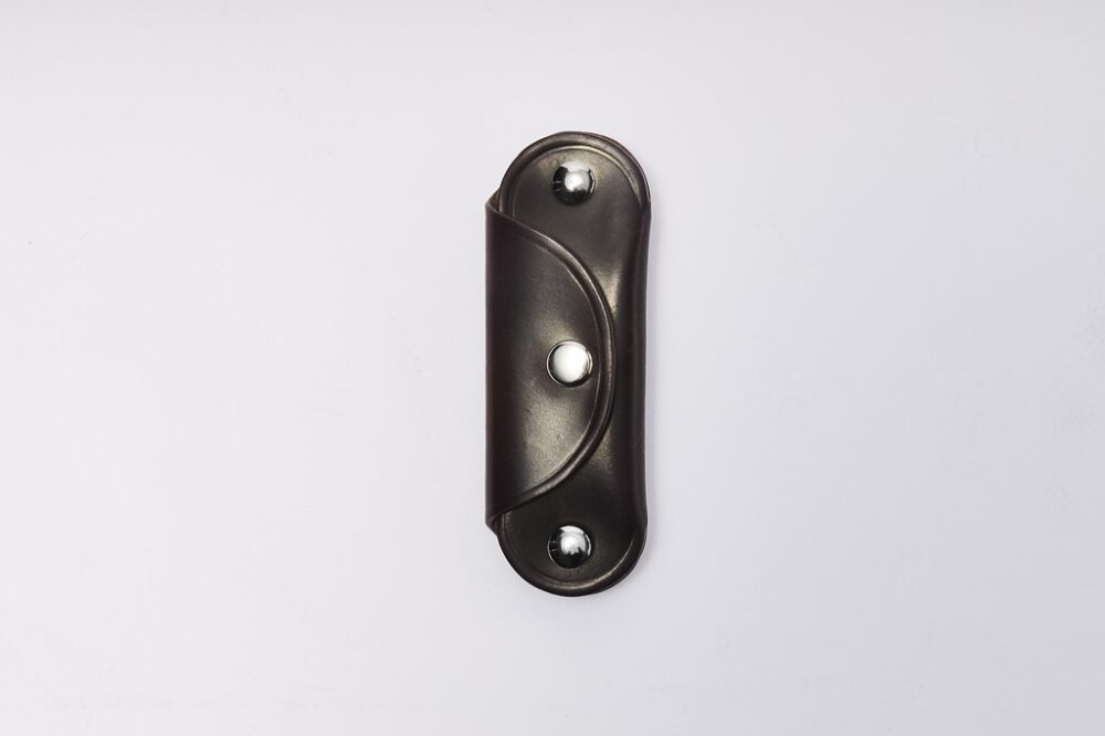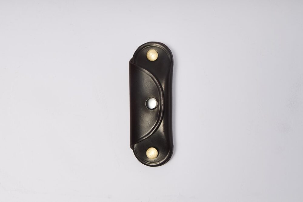 中央のスナップボタンと、左右に各1つの留め具を配置したキーケースの定石とも言えるデザイン。エッジは縫製をせず、ラインとコバの磨きだけを施したミニマルなデザイン。