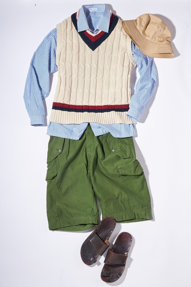 もはや多くを語るまい、まるで教科書のような王道アメトラスタイルで着飾るには、チルデンベストが欠かせない。紺ブレの下に着ることを考慮したややタイトめのフィッティングで、ごわつくこともなく快適にインナー使いを楽しめる。