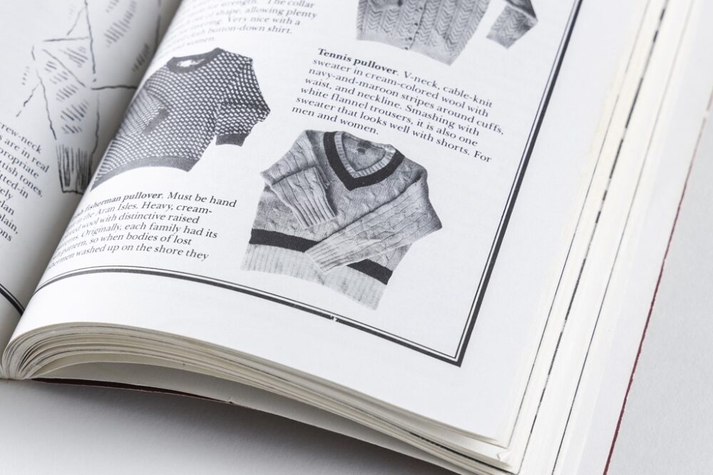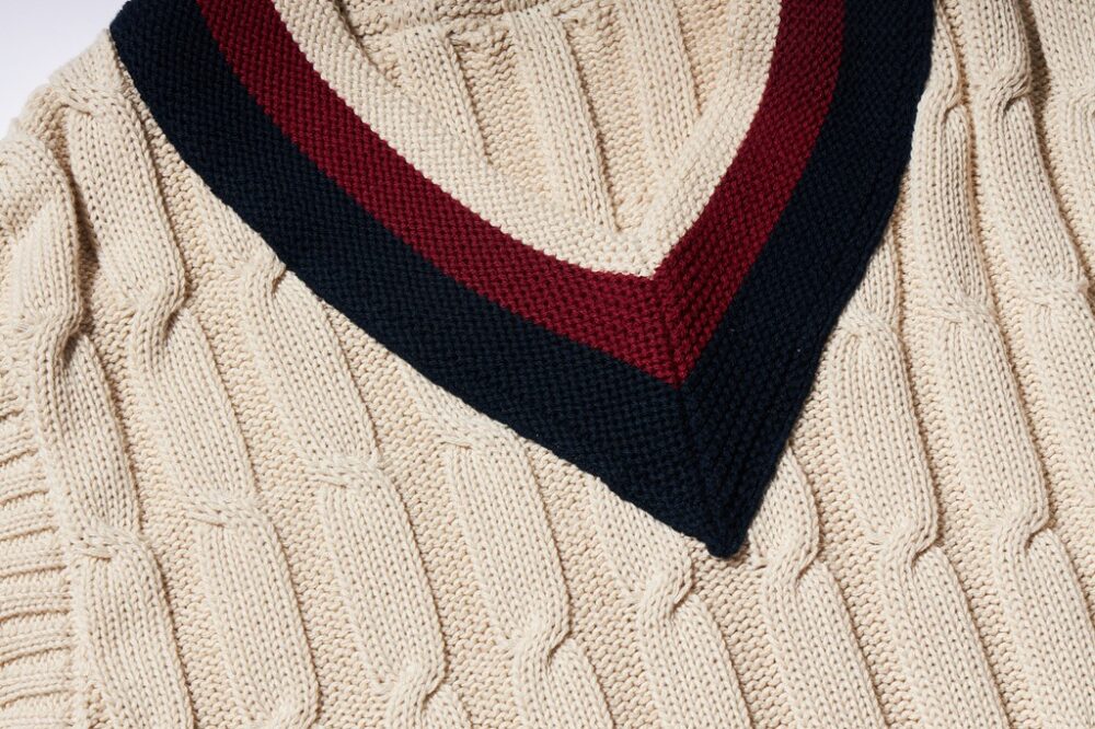 前回同様、一番意識しているのはプレッピースタイルの「教科書的チルデンニット」を作ること。我らアメトラ好きのバイブルである『オフィシャル・プレッピー・ハンドブック』には「Vネック・ケーブル編み・クリーム色のボディ・ネイビーとボルドーのストライプ」がその条件と記載されている。