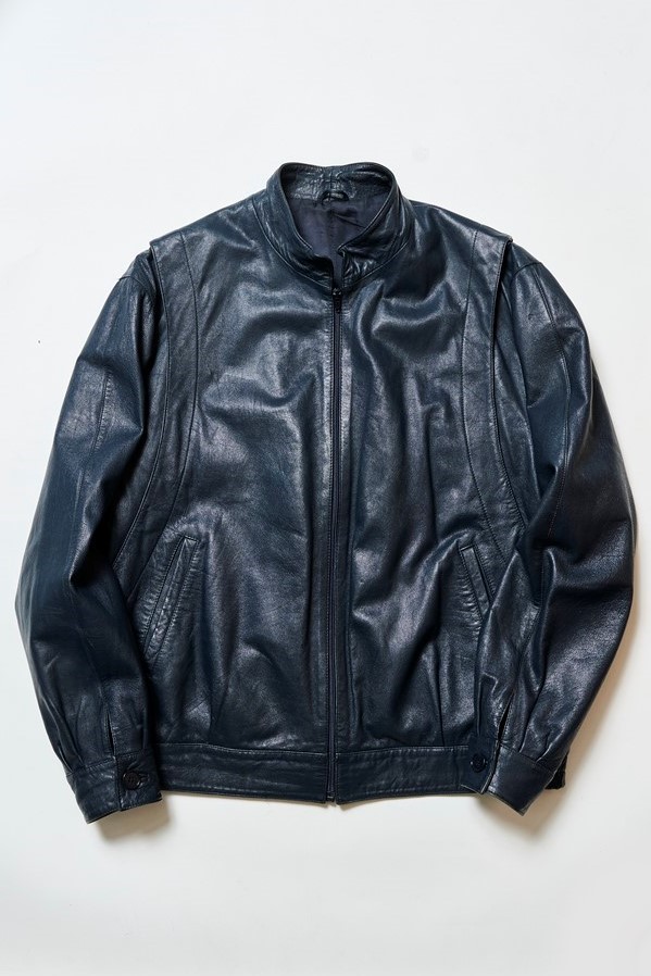 ネイビーレザーのブルゾンはイタリア製のもの。
