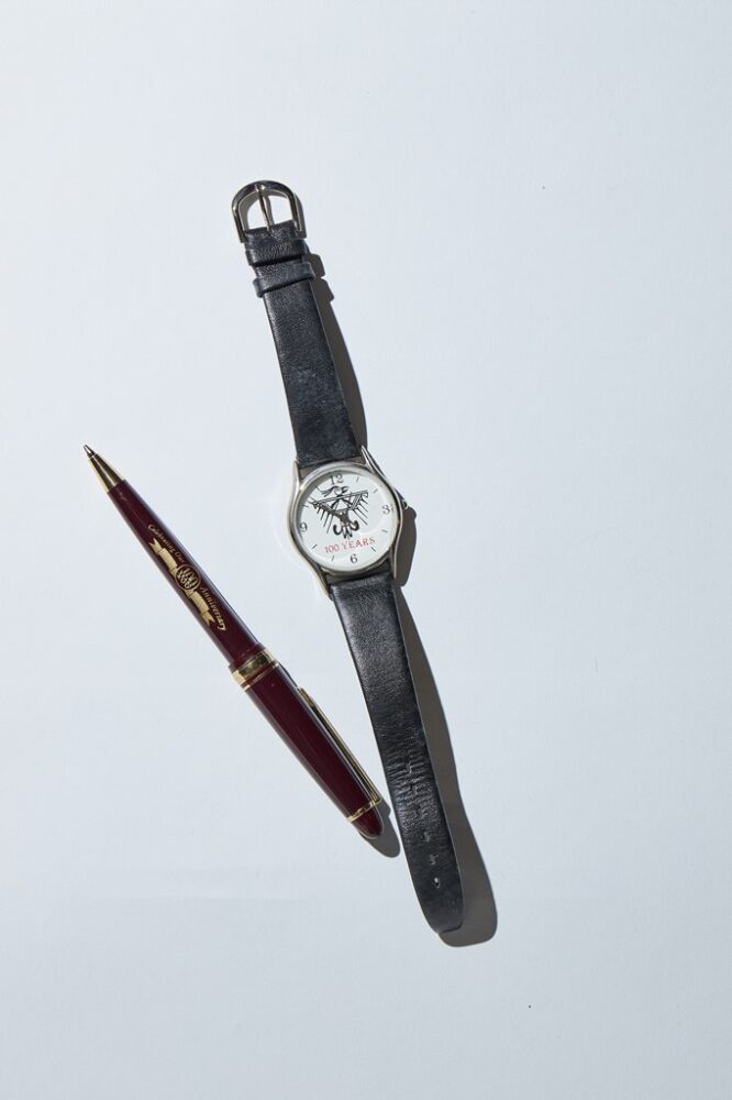 2000年に100周年を迎えたオルテガの記念パーティーで贈られた腕時計とペン。この式に参加した日本人はもちろん小林さんひとりだ。