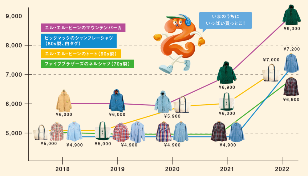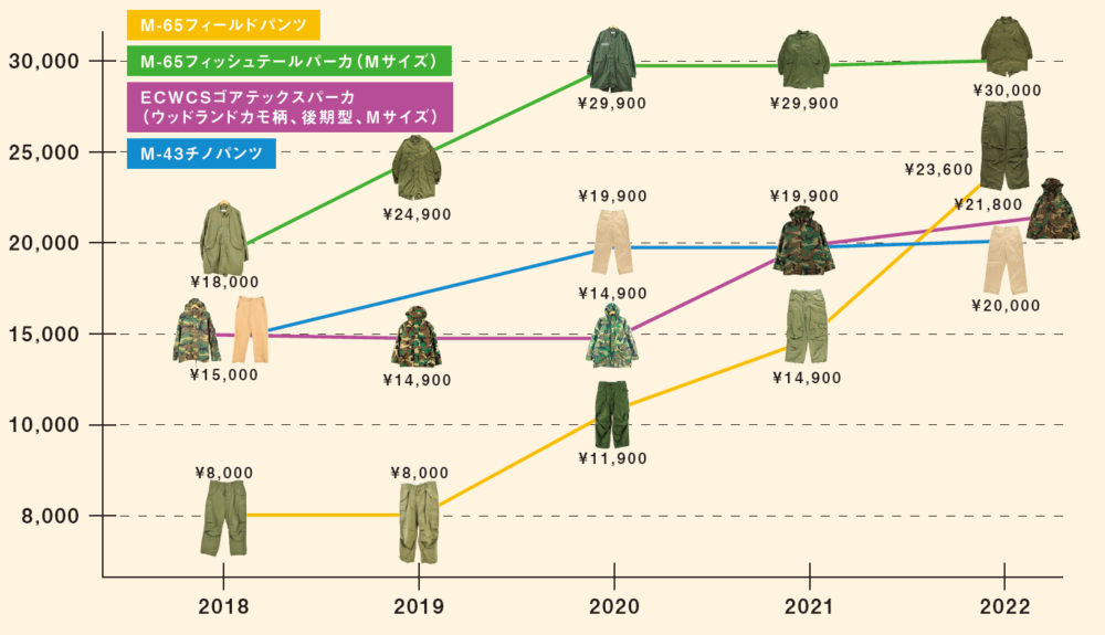 幅広い世代から根強い人気を集めるのは、やっぱりミリタリーアイテムだ。とくに、ここ最近のM-65フィッシュテールパーカ着用率は目を見張るものがあり、ライナーやフードが付かないシェル単体でも価格は3万円まで高騰している。上げ幅だけを見たら、M-65フィールドパンツは2019年から2022年の間に、1万5000円以上も値上げしているのには驚き。タマ数が多いアイテムとはいえ、気づけば枯渇状態なんてことにも!?