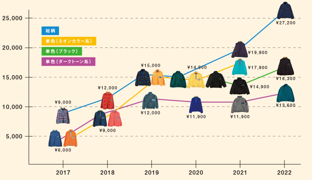 “パタゴニア、最後の良心”と思っていたシンチラ・スナップTも、ファッション業界全体のフリース人気と相まってぐんぐんと価格が上昇。単色のなかでもネオンカラーやブラックの人気カラーは価格もやや付けられている。総柄に関しては柄によって価格に差がある様子。やはりタートル柄が不動の人気を誇っているが、ネイティブ調のミネハハ柄やテウェルチェ柄は2022年時点で1万6300円ほどの価格設定になっている。