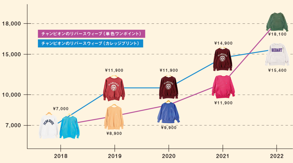 レギュラー古着の価格高騰を肌で感じたのは90年代製のリバースウィーブからだったかも。アメリカ製はおろか、そのあとのメキシコ製においても1万円以下で買えたのは、もう遠い記憶だ……。2022年になると、シンプルな“目つき”の単色が、いつの時代も高い人気を誇っていたカレッジプリントを抜いて相場が逆転したことにも注目したい。単色の“目無し”は若年層からの人気を集めて、さらに価格が高騰しているぞ!