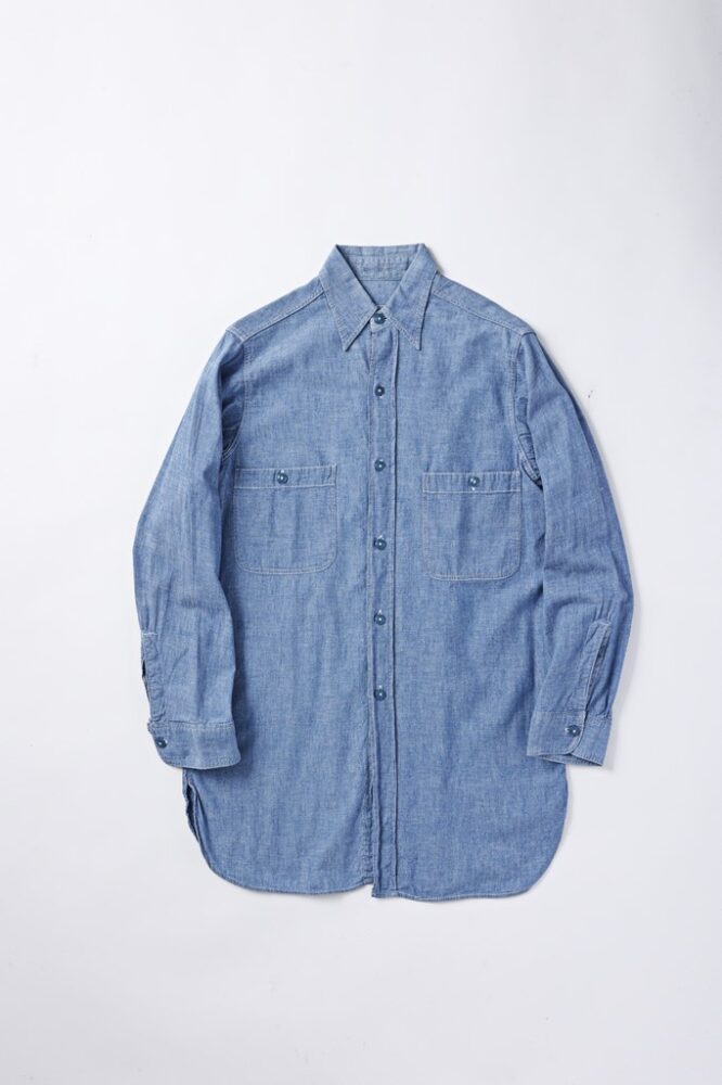 ボタンがブルーカラーの樹脂尿素ボタンなので一目瞭然の40sアメリカ海軍のシャンブレーシャツ。着丈の長さも特徴。4万3780円(デザートスノー 千葉 TEL043-225-9600)