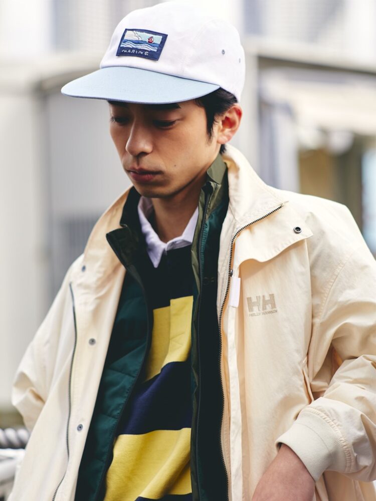 ヘミングウェイも愛用したことで知られるロングビルキャップは、日射しを遮る目的でツバを長く設定し作られたもの。大好評だった第一弾のテーマは「アウトドア」だったため、カラーリングもアースカラーを基調とし、手刺繍による「mountain」のワッペンを備えたものとしたが、第二弾は来るべき春夏シーズンをイメージし、白と淡いブルーのコンビネーションに。ワッペンにはヨットを浮かべた大海原と「MARINE」の文字。意外と見かけない白ボディのキャップはマリンスタイルのみならず、洗いざらしの白いBDシャツとも相性抜群! ツバが大きいことで「小顔効果がある」と意外な視点での評価も高かった。ビーチやマリンスポーツのお供に!