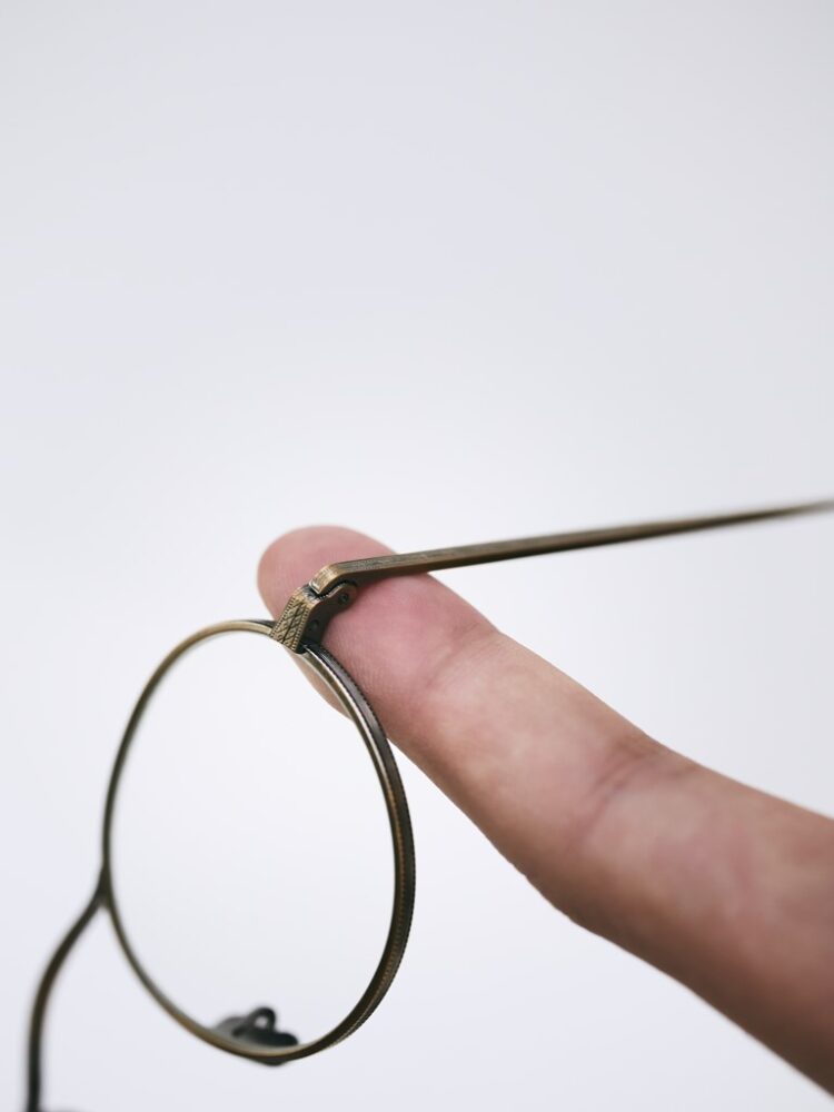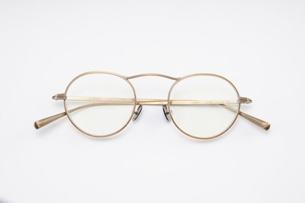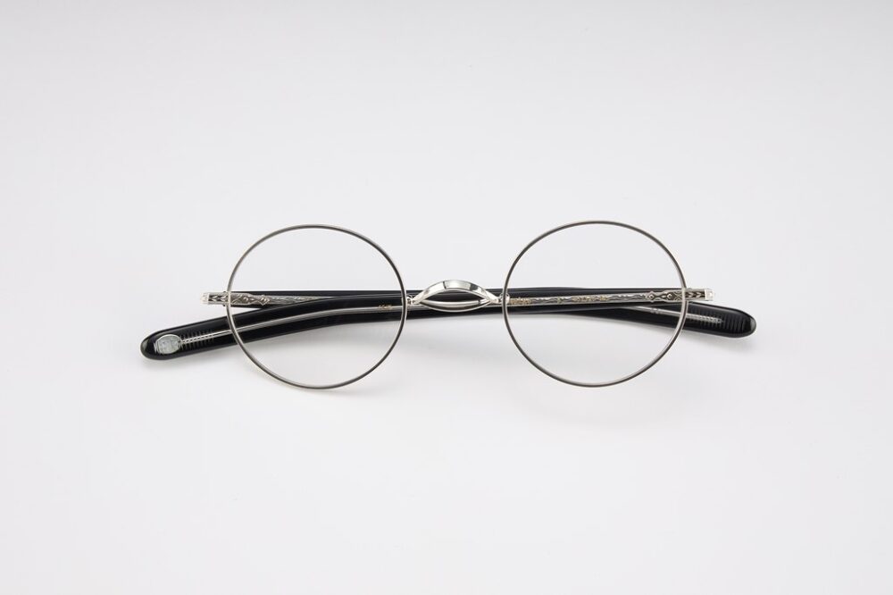 1923年に世界で初めて登場したクリングス一体の鼻当てや湾曲したブリッジなど、旧きよき意匠を盛り込んだデザインを軽くて丈夫なチタン素材でアップデート。手掘りの金型を使った彫金は蝶番の内側にまで施されるなど、とことん抜かりない。4万4000円