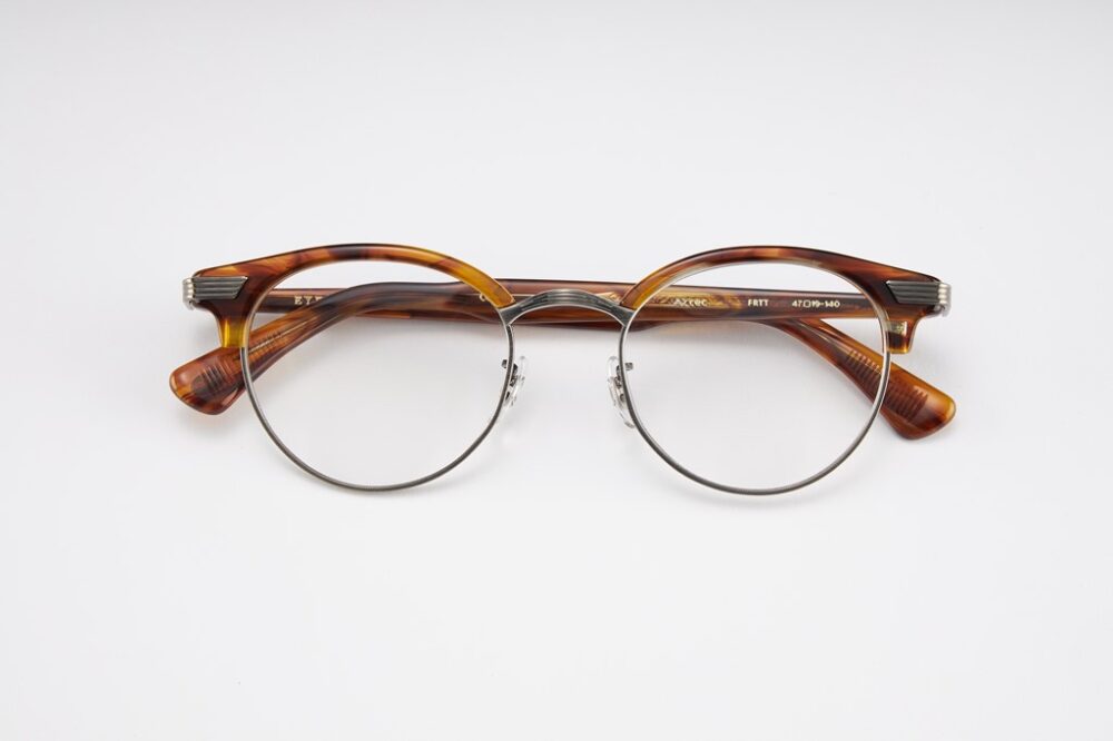 定番コンビネーションフレームの新作。フロント上部が冠のような型で、通称クラウンパントとして知られるフレンチヴィンテージの代表的デザインを踏襲している。クリングスと一体型となるブリッジやヨロイからテンプルにかけての彫金も美しい。4万4000円
