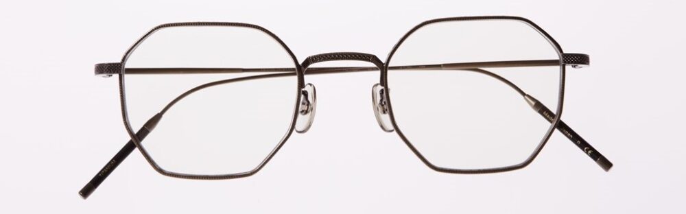 フルチタン製で強度が高く、長く愛用できる。「多角形ながら丸みを帯びているため違和感はありません。フィンチというツルのないメガネによく見られるデザインを採用したブリッジも面白いですね」。4万9500円