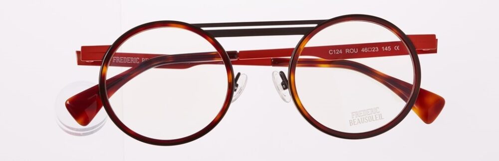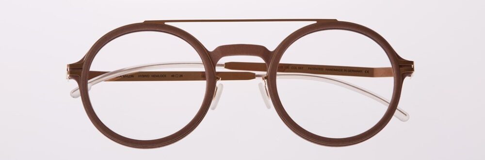 薄いステンレススチールと立体的構造のフロントが特徴のハイブリッドシリーズより。硬質な印象のテンプルが、コミカルになりがちなラウンド型を引き締める。「太さを変えた2本のブリッジがユニーク」。7万9200円