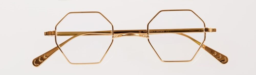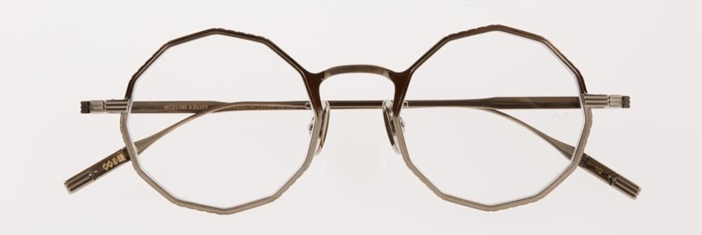 一山式メタルフレームの中でも、独特な空気感を漂わせるオクタゴン型。「シルバー925に金メッキがあしらわれグッとゴージャス感が高まりました。程よい重さも安定感を高めるポイントになっています」。9万2400円