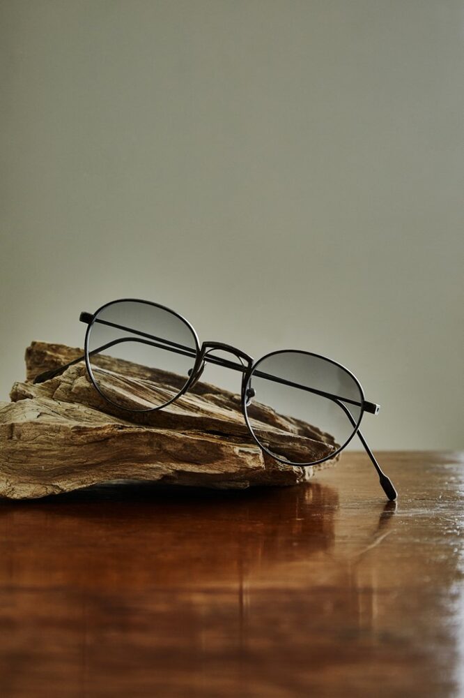 薄いクリアグレーのアセテートを使ってウェリントン型に。リムの上下で太さにコントラストを付けていたり、彫金を施された芯がねがテンプルからのぞいていたりで、どの角度から見ても知的な印象を醸し出す。5万3900円