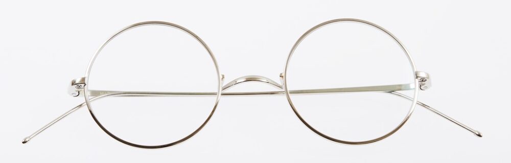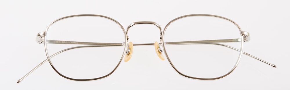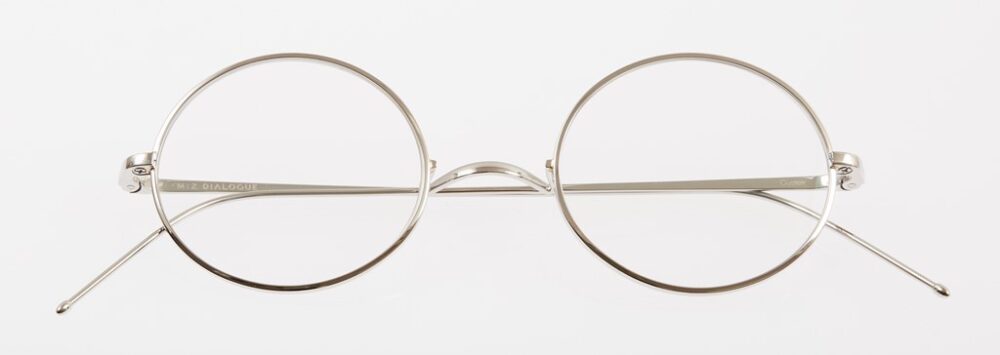 ラウンド型フレームと一山式ブリッジがクラシカル。ミズ ダイアログが使う素材は、1930年代に日本で開発されたサンプラチナ。鯖江の水島眼鏡にはサンプラチナ製のオーダーフレームを手がけていた歴史あり。5万1700円